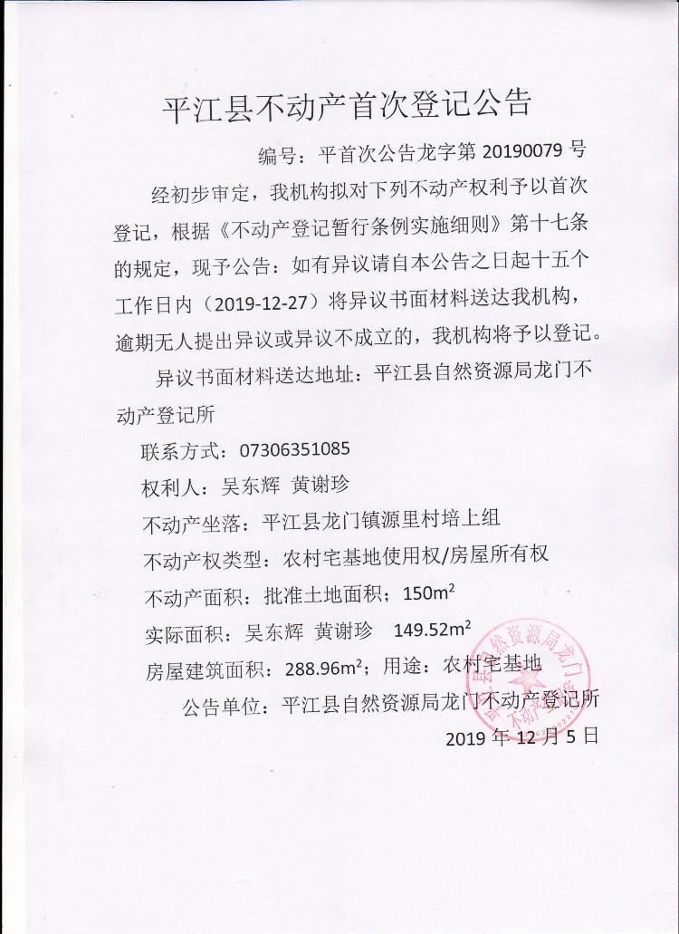 吴东辉 黄谢珍平江县不动产首次登记公告