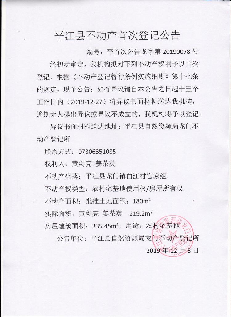 黄剑亮 姜茶英平江县不动产首次登记公告