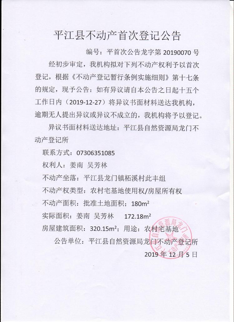 姜南 吴芳林平江县不动产首次登记公告