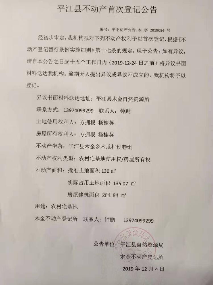 方拥根 杨桂英不动产首次登记公告