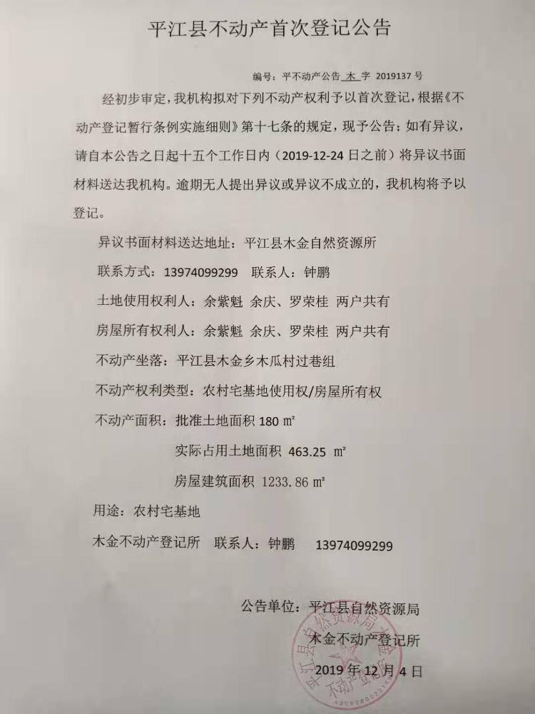 余紫魁 余庆 、余罗荣桂两户共有不动产首次登记公告