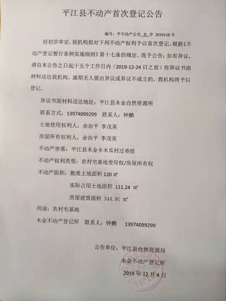 余治平 李茂英不动产首次登记公告