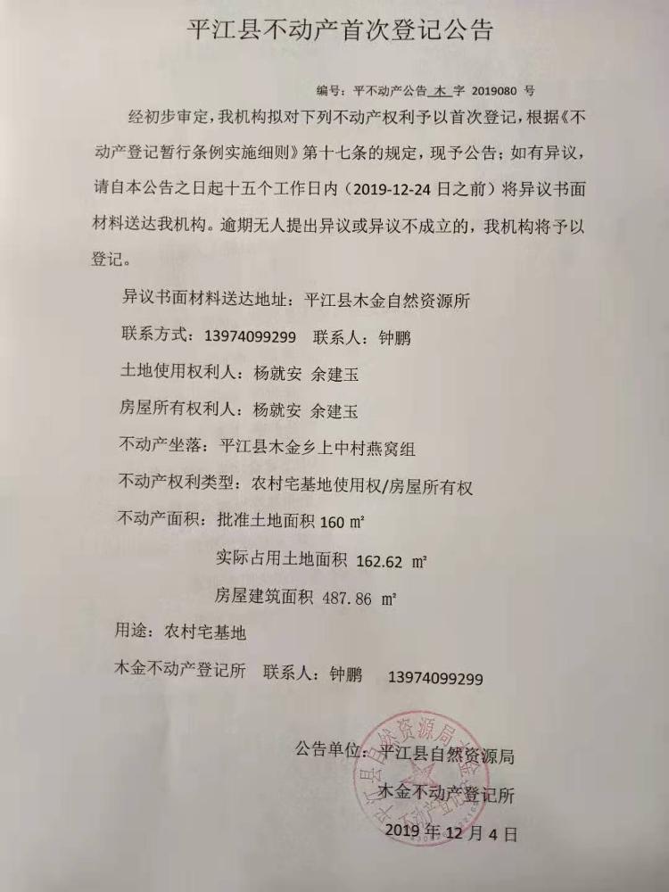 杨就安 余建玉不动产首次登记公告