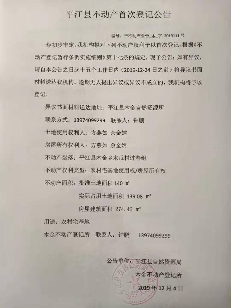 方燕如 余金娥不动产首次登记公告