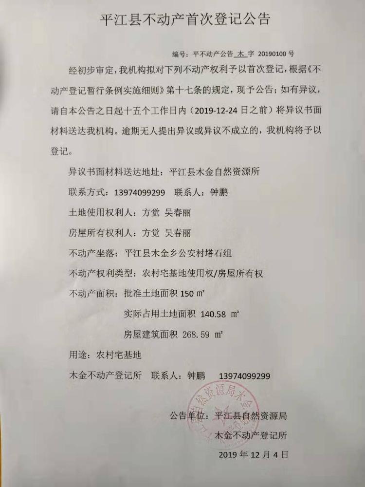 方觉 吴春丽不动产首次登记公告