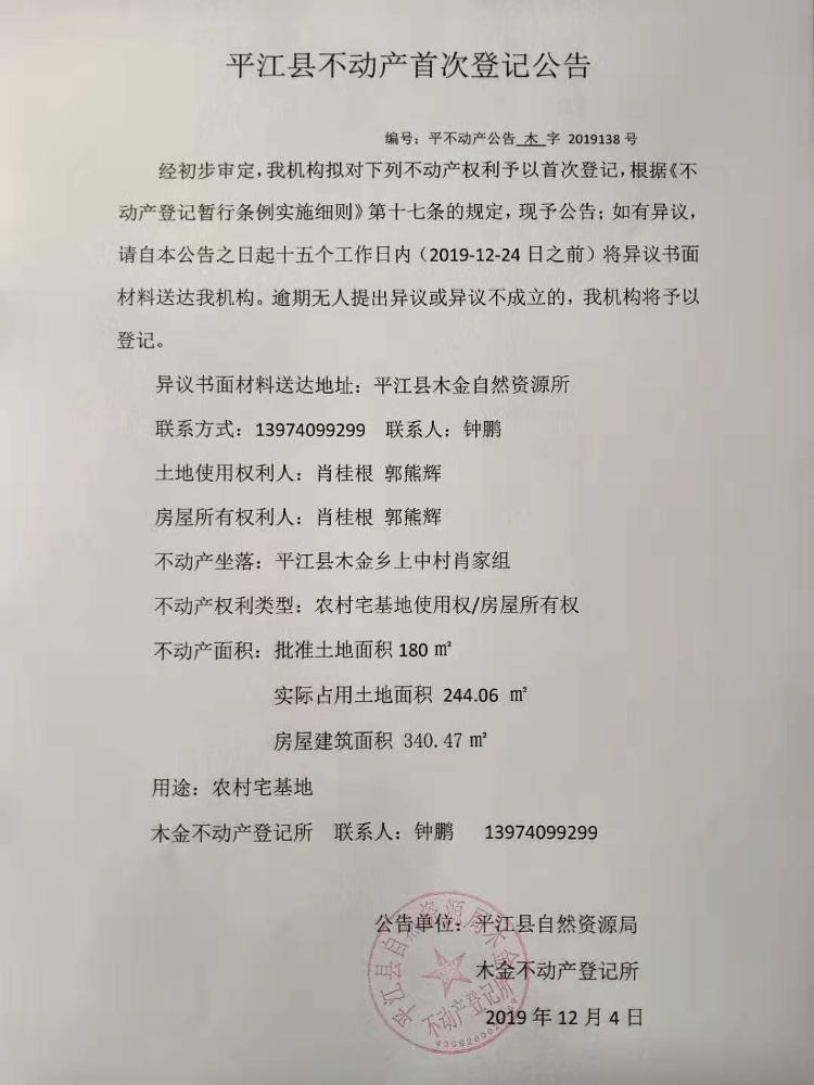 肖佳根 郭熊辉不动产首次登记公告