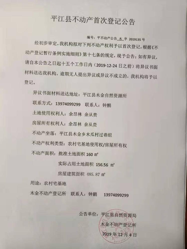 余昂林 余从贵不动产首次登记公告