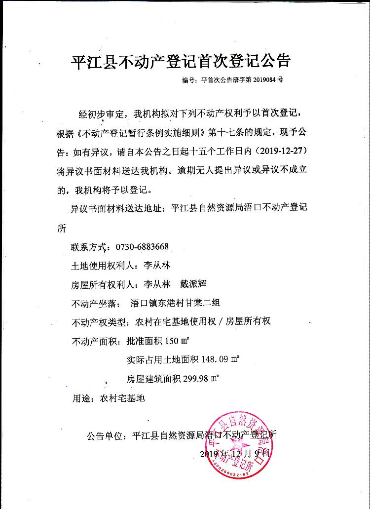 李从林 戴派辉 平江县不动产首次登记公告 浯字第2019084号