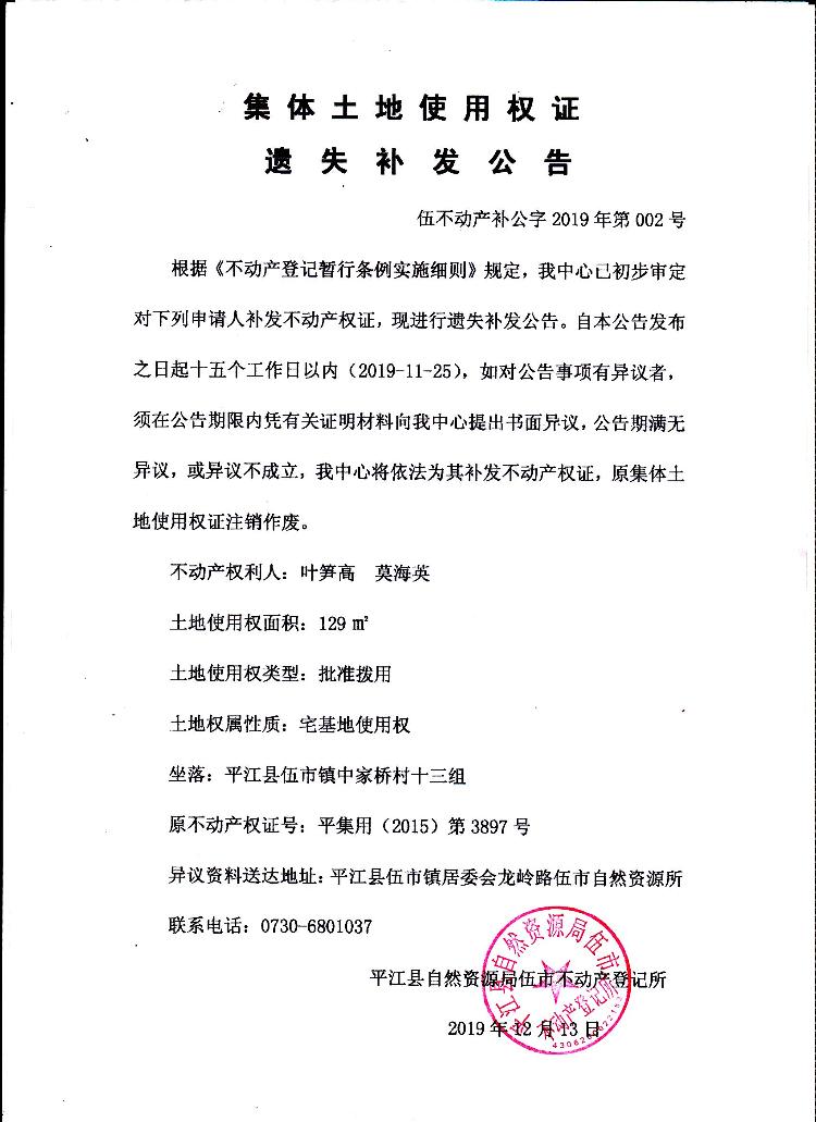 叶笋高 莫海英 集体土地使用权证遗失补发公告 伍不动产公字2019年002号