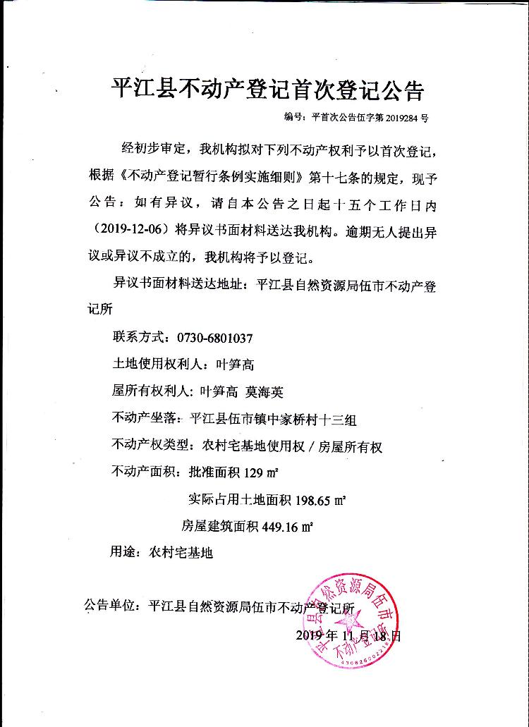 叶笋高 莫海英 平江县不动产首次登记公告 伍字第2019284号