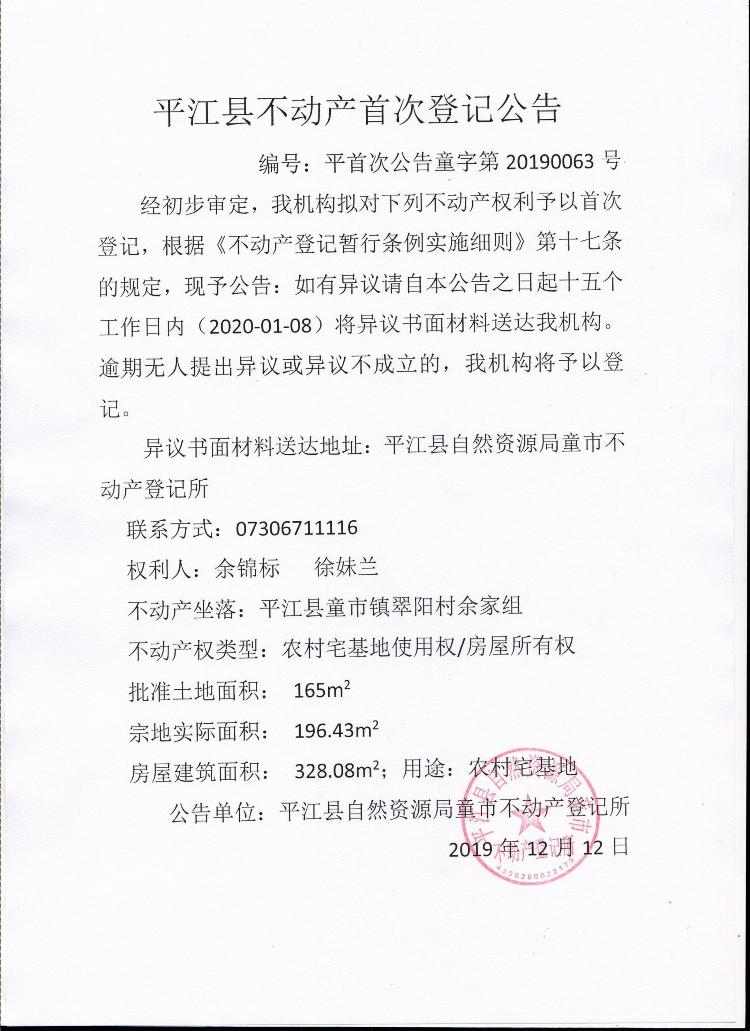 余锦标 徐妹兰不动产首次登记公告