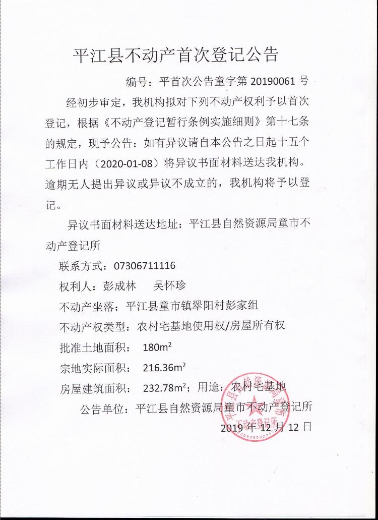 彭成林 吴怀珍不动产首次登记公告