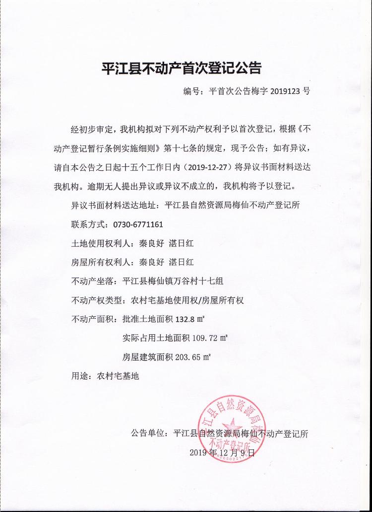 秦良好 湛日红平江县不动产首次登记公告