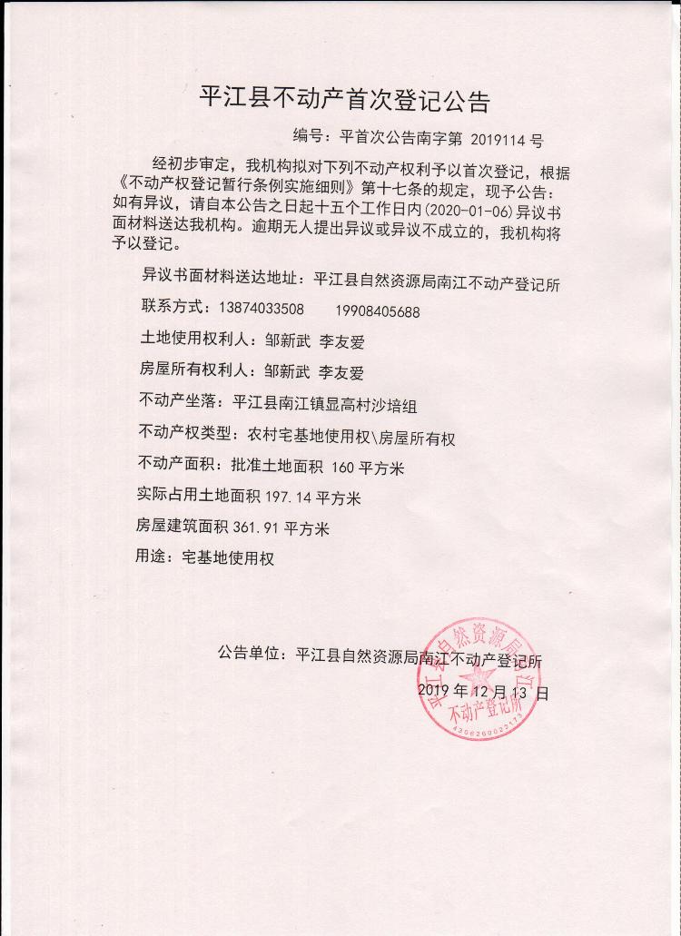 邹新武 李友爱不动产首次登记
