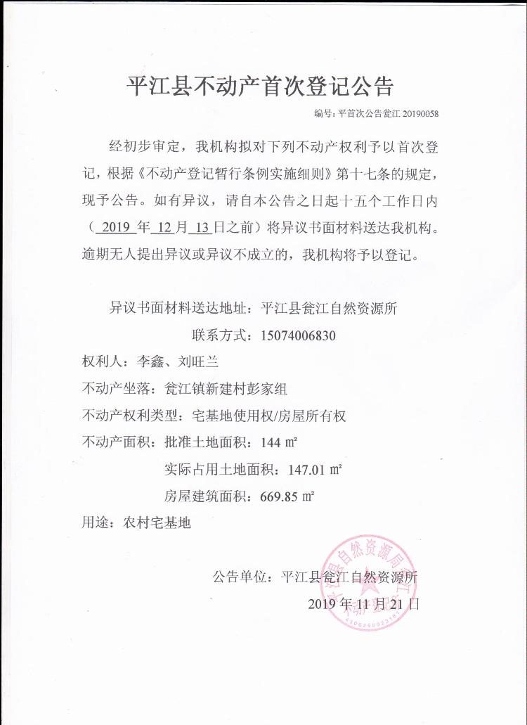 李鑫 刘旺兰不动产首次登记公告