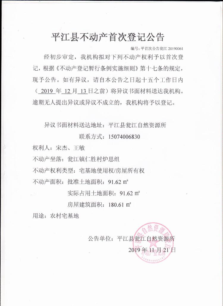 宋杰 王敏不动产首次登记公告