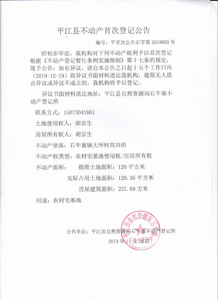 胡宗生不动产首次登记公告