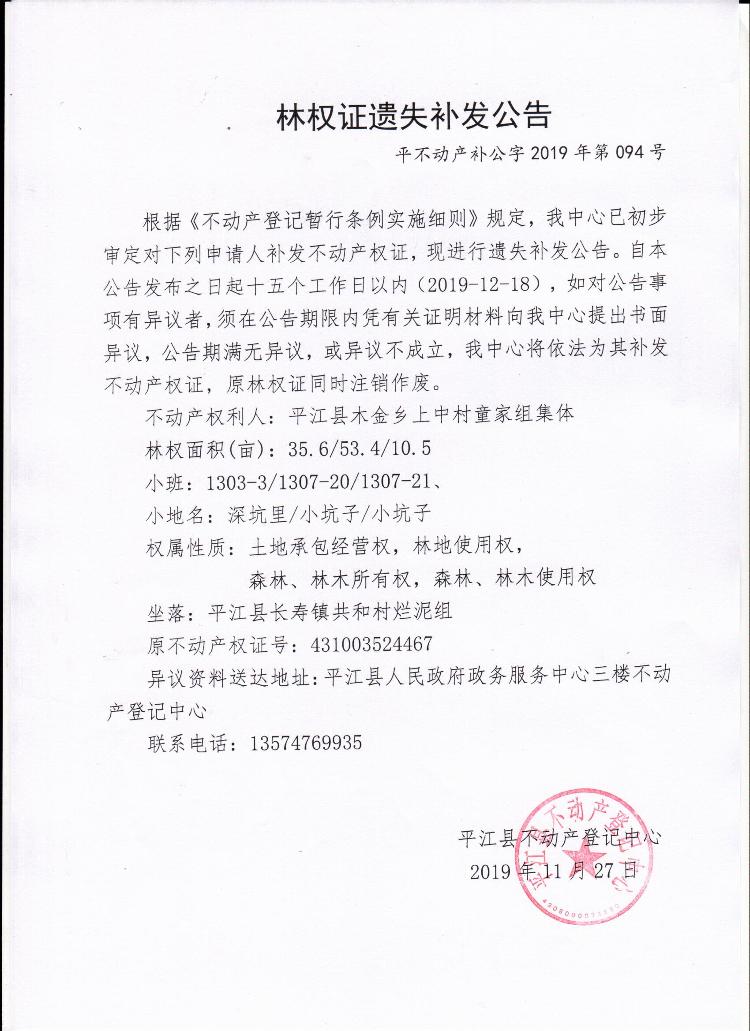 平江县木金乡上中村童家组集体林权遗失补发公告2
