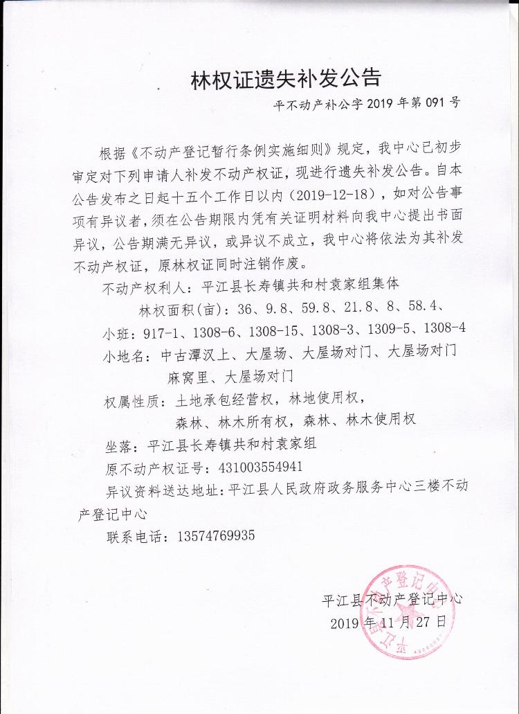 平江县长寿镇共和村袁家组集体林权遗失补发公告