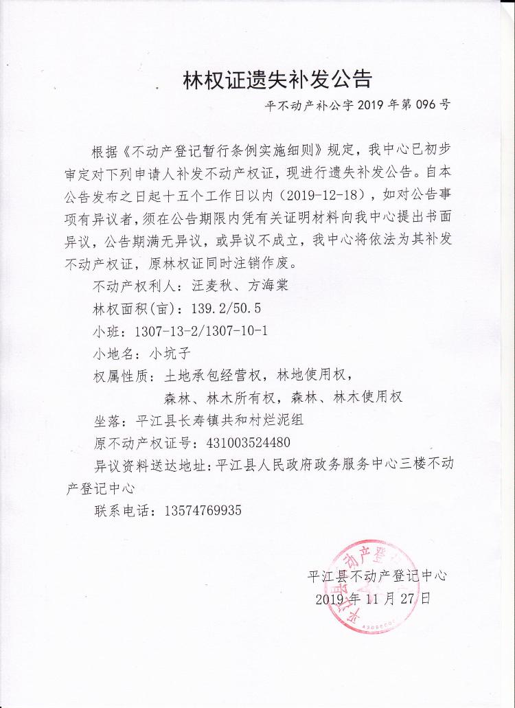 汪麦秋 方海棠林权遗失补发公告
