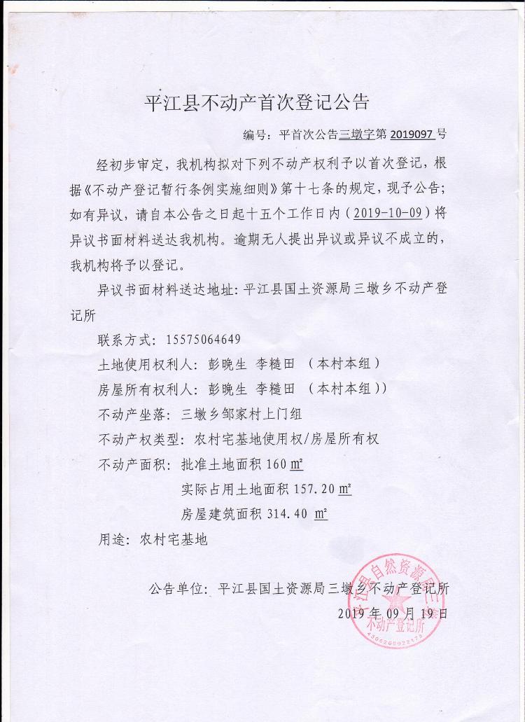 平首次公告三墩字第2019097号
