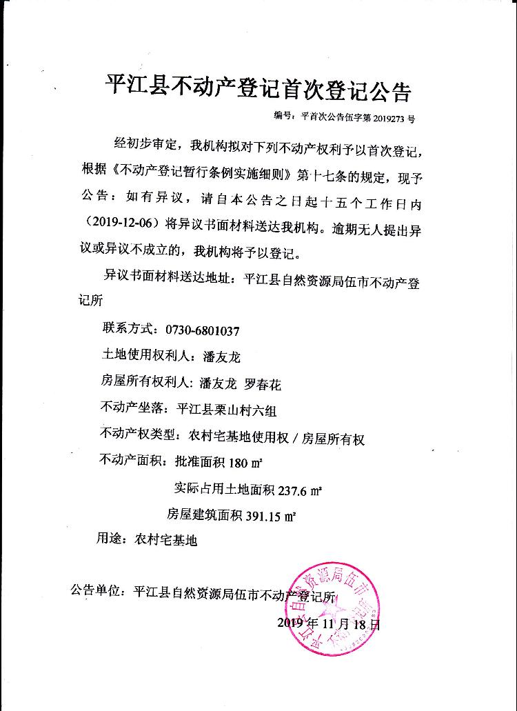 潘友龙 罗春花平江县不动产首次登记公告 伍字第2019273号