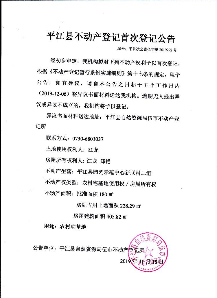 江龙 郑艳 平江县不动产首次登记公告 伍字第2019272号
