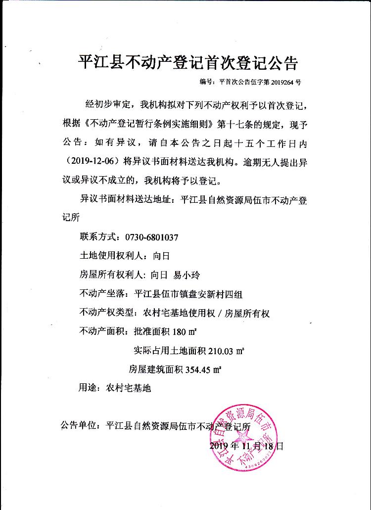 向日 易小玲 平江县不动产首次登记公告 伍字第2019264号