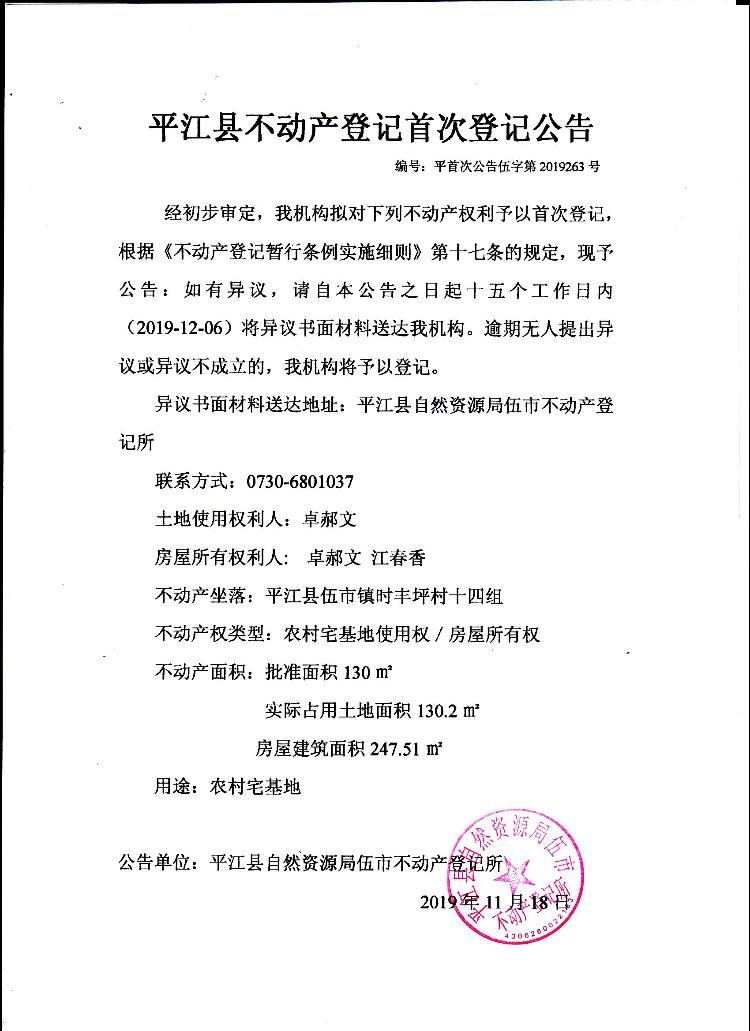 卓郝文 江春香 平江县不动产首次登记公告 伍字第2019263号