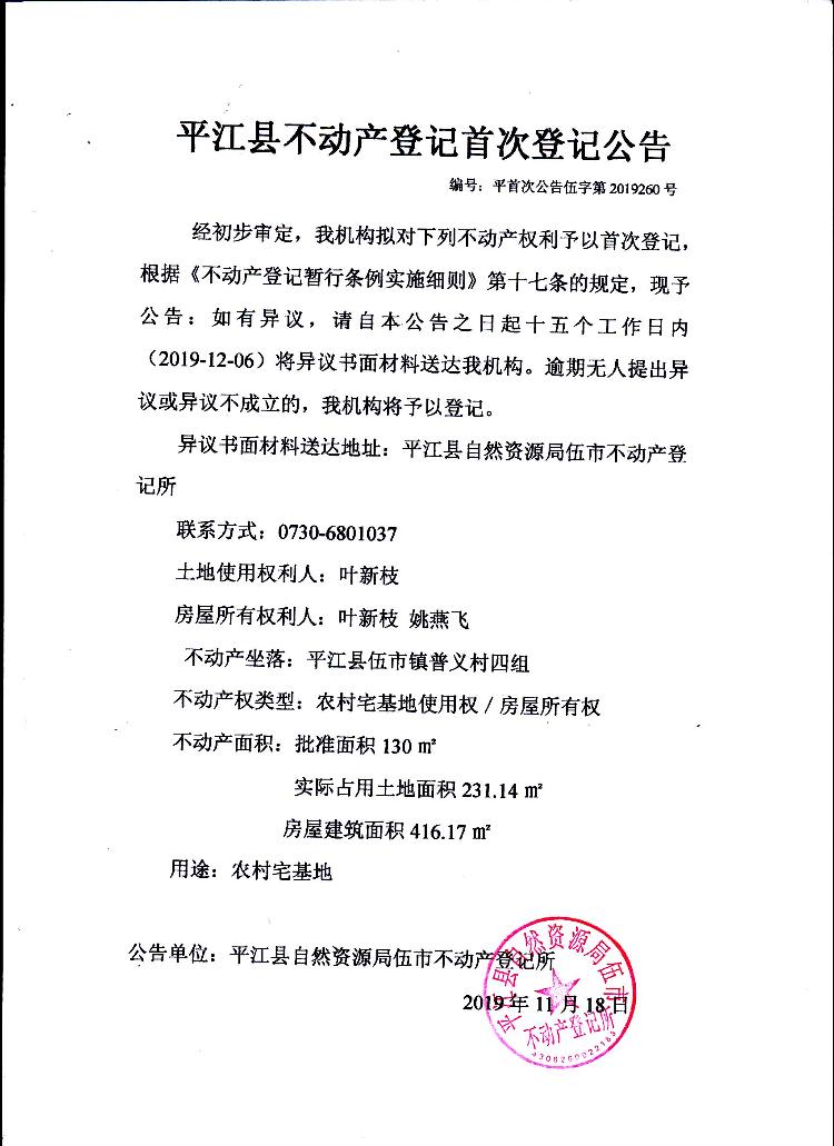 叶新枝 姚燕飞 平江县不动产首次登记公告 伍字第2019260号