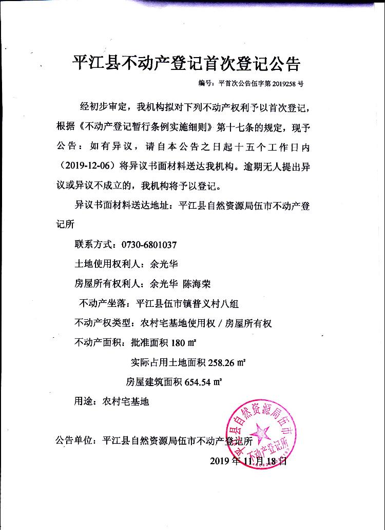 余光华 陈海荣 平江县不动产首次登记公告 伍字第2019258号