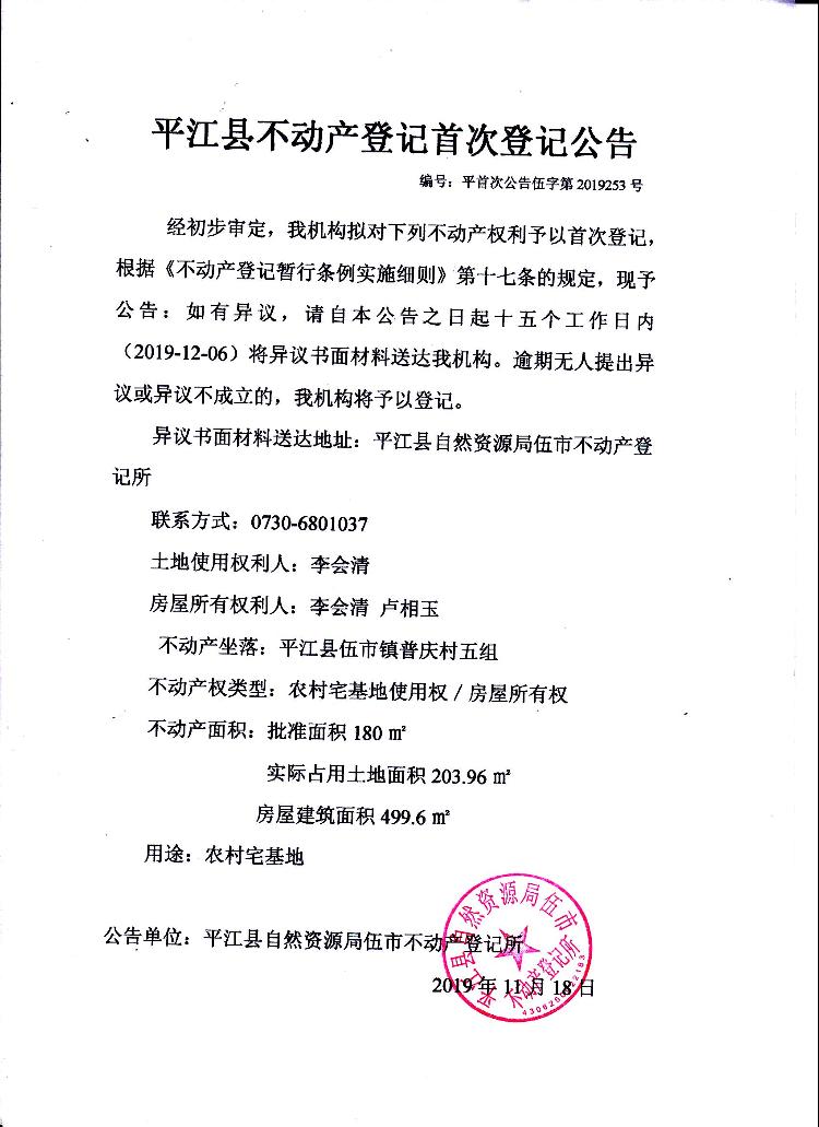 李会清 卢湘玉 平江县不动产首次登记公告 伍字第2019253号