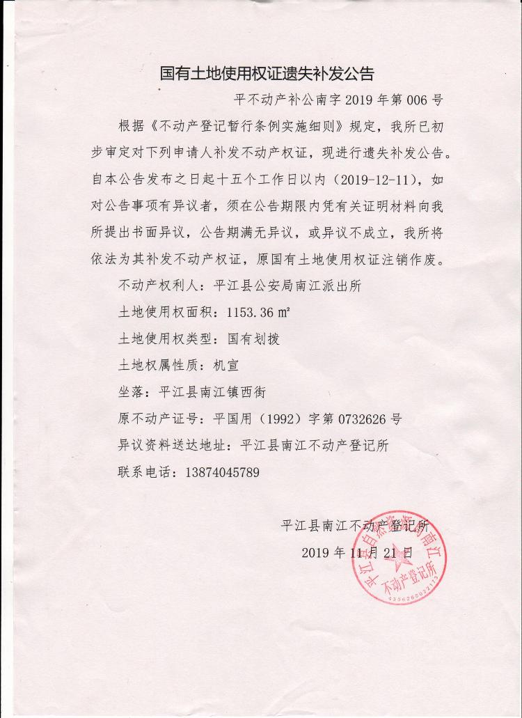 平江县公安局南江派出所国有土地使用权证遗失补发登记公告