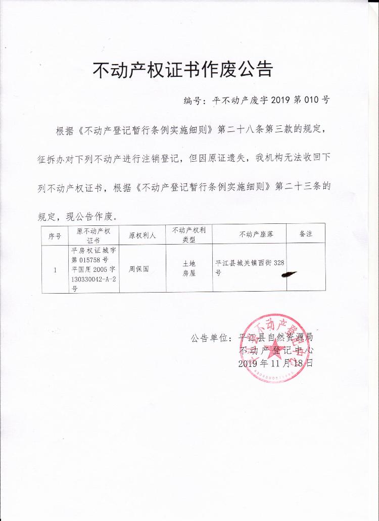 周保国不动产权证书作废公告