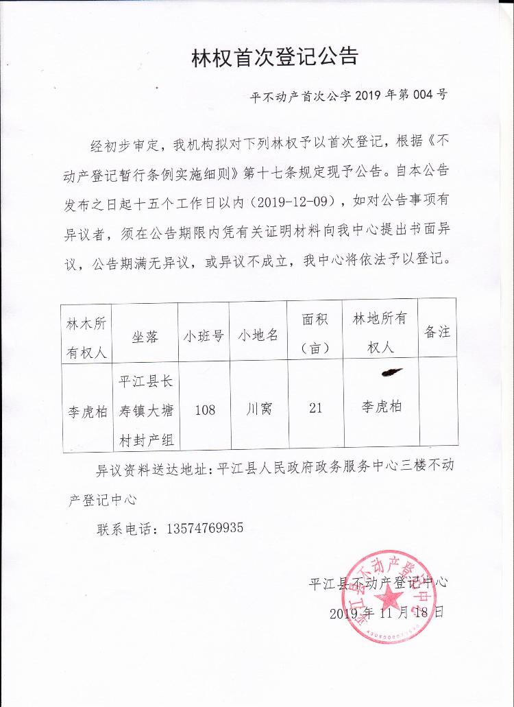 李虎柏林权首次登记公告
