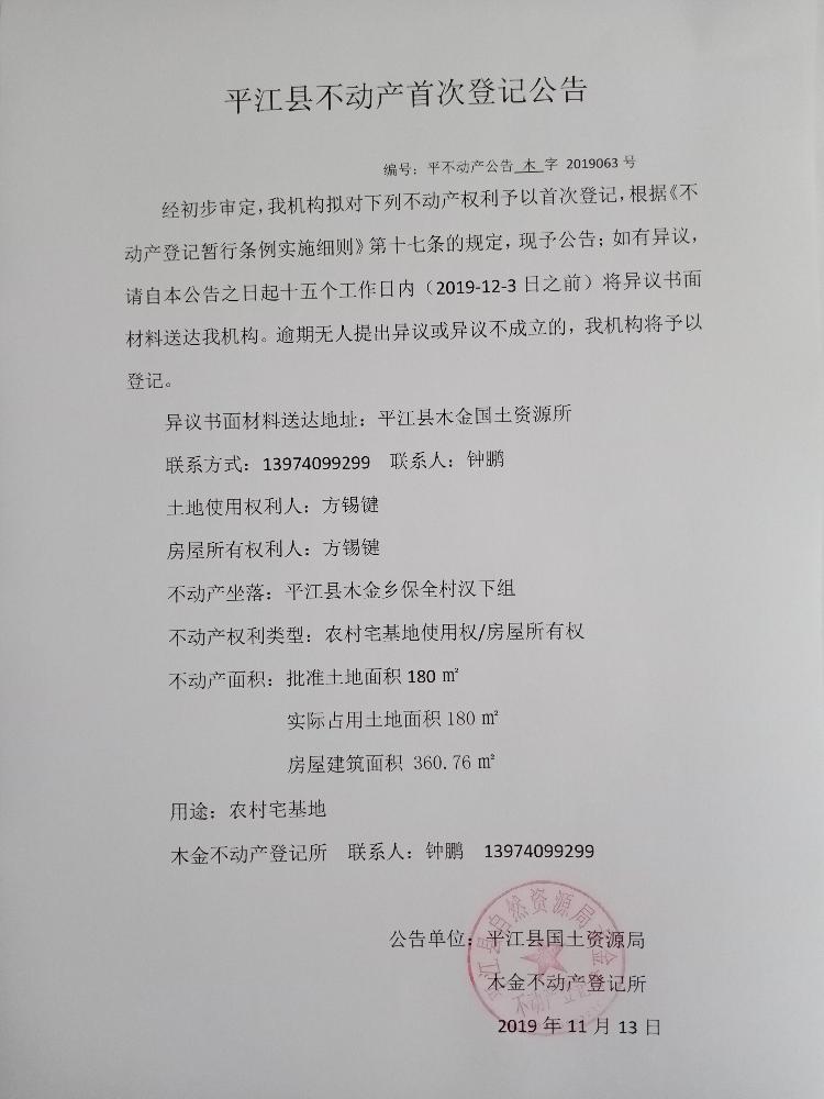 方锡键不动产首次登记公告