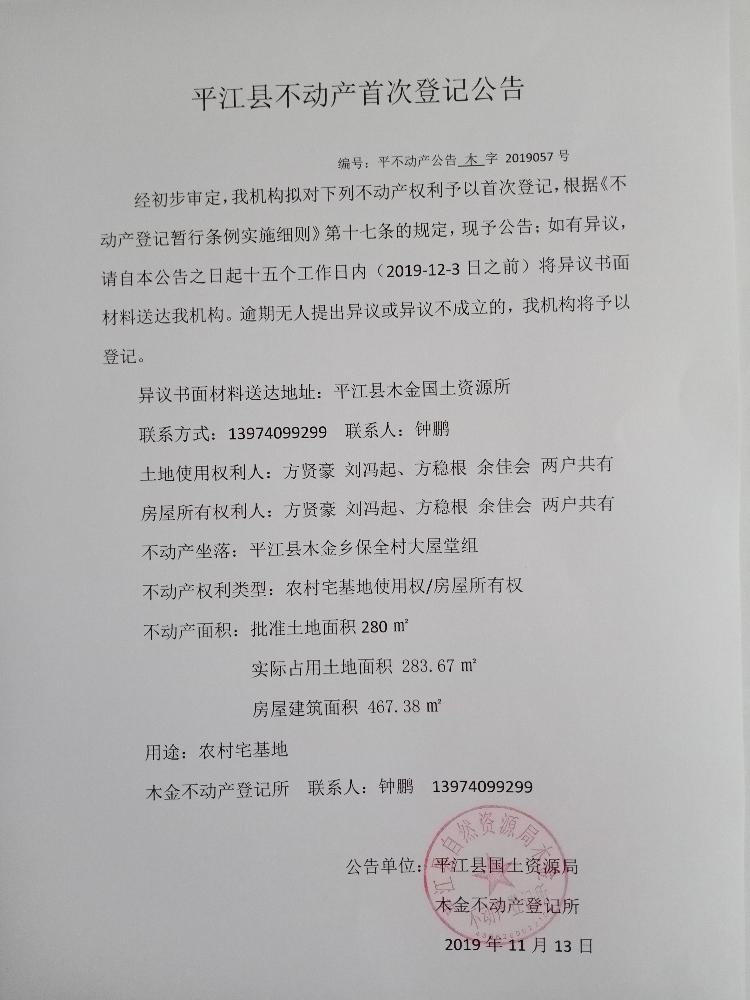方贤豪 刘冯起、方稳根 余佳会 两户共有不动产首次登记公告