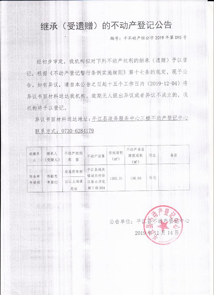 陈献忠 李景红继承(受遗赠)的不动产登记公告