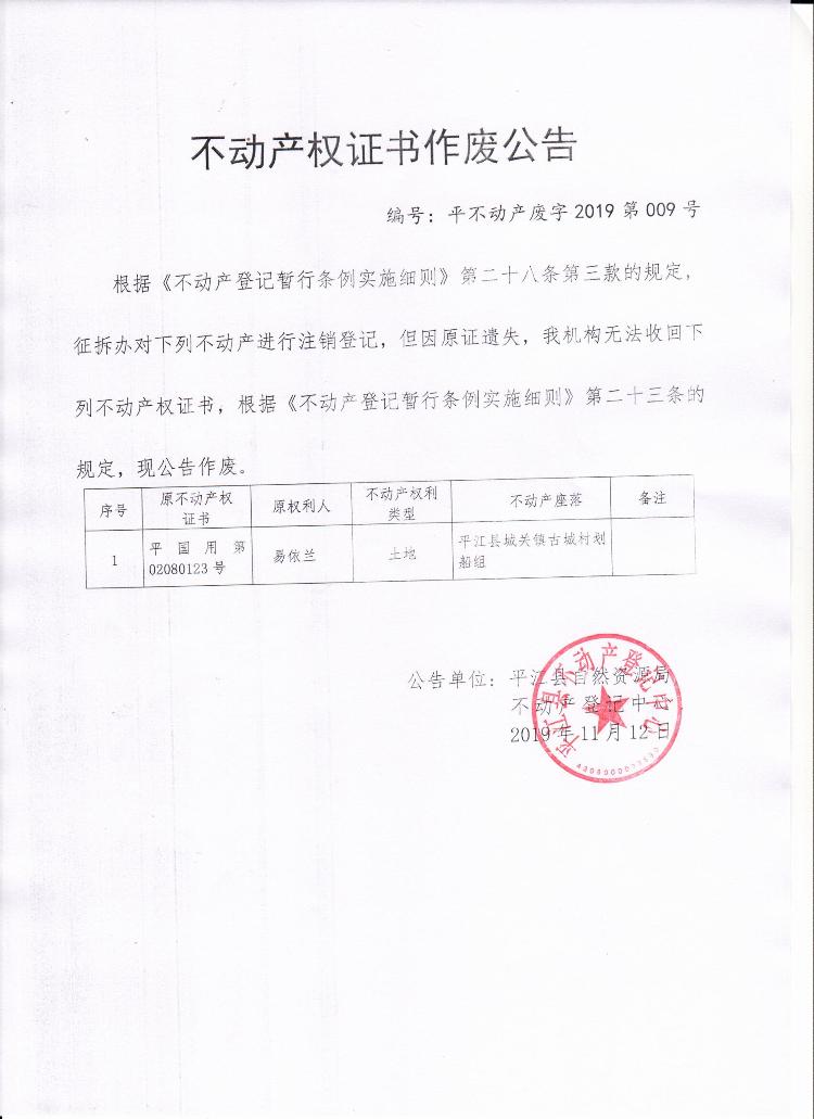 易依兰不动产权证书作废公告