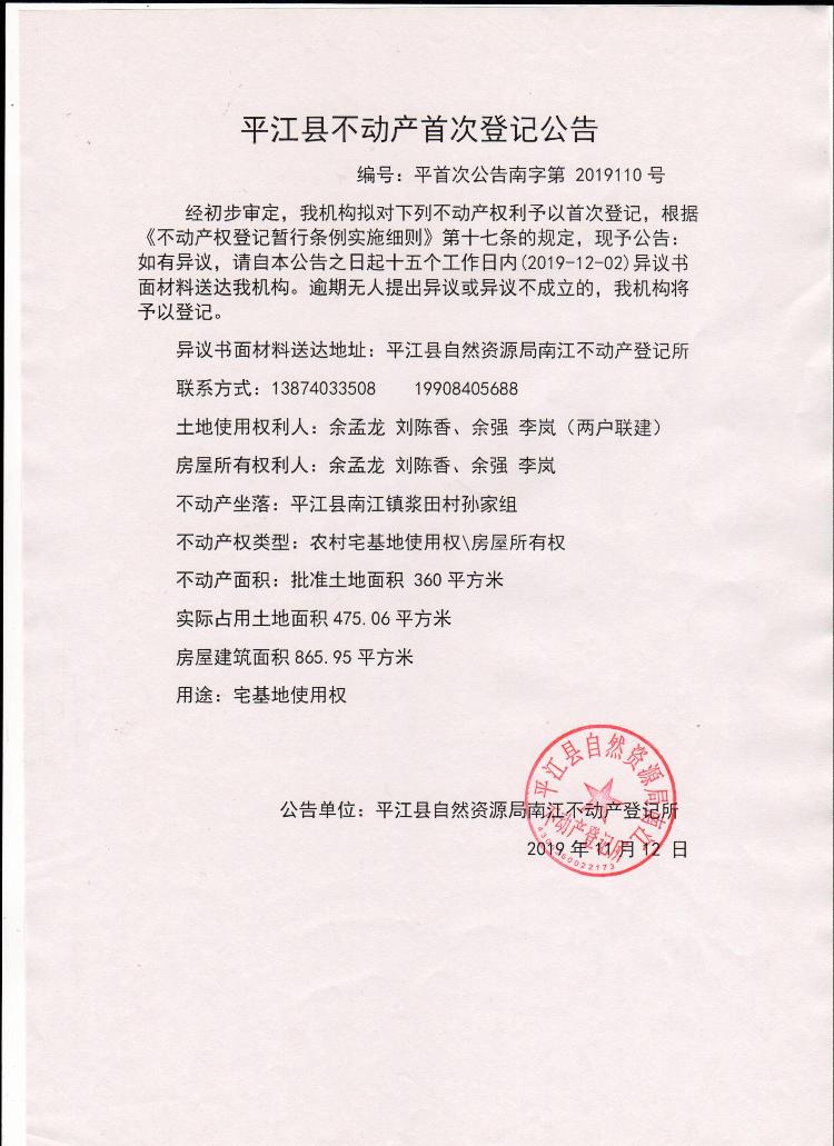 余孟龙 刘陈香、余强 李岚(两户联建)不动产首次登记公告