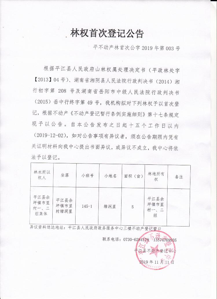 平江县余坪镇市里村一、二组集体林权首次登记公告