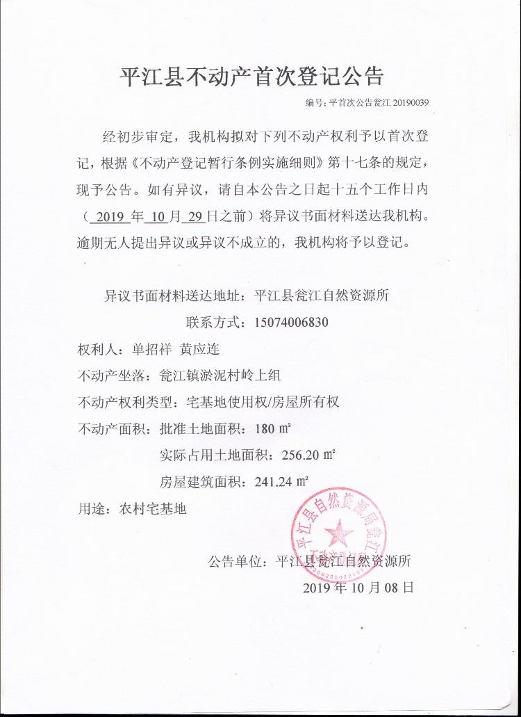 单招祥 黄应连不动产首次登记公告