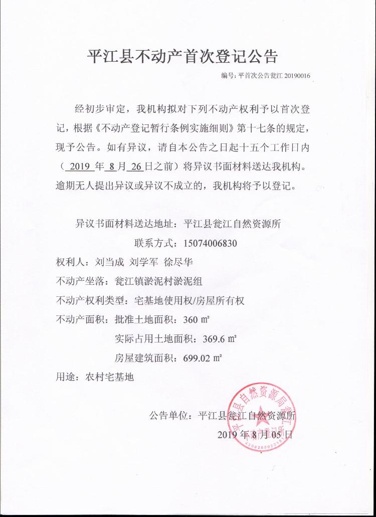 刘当成 刘学军 徐尽华不动产首次登记公告