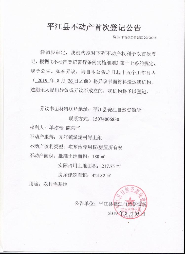 单称奇 陈菊华不动产首次登记公告