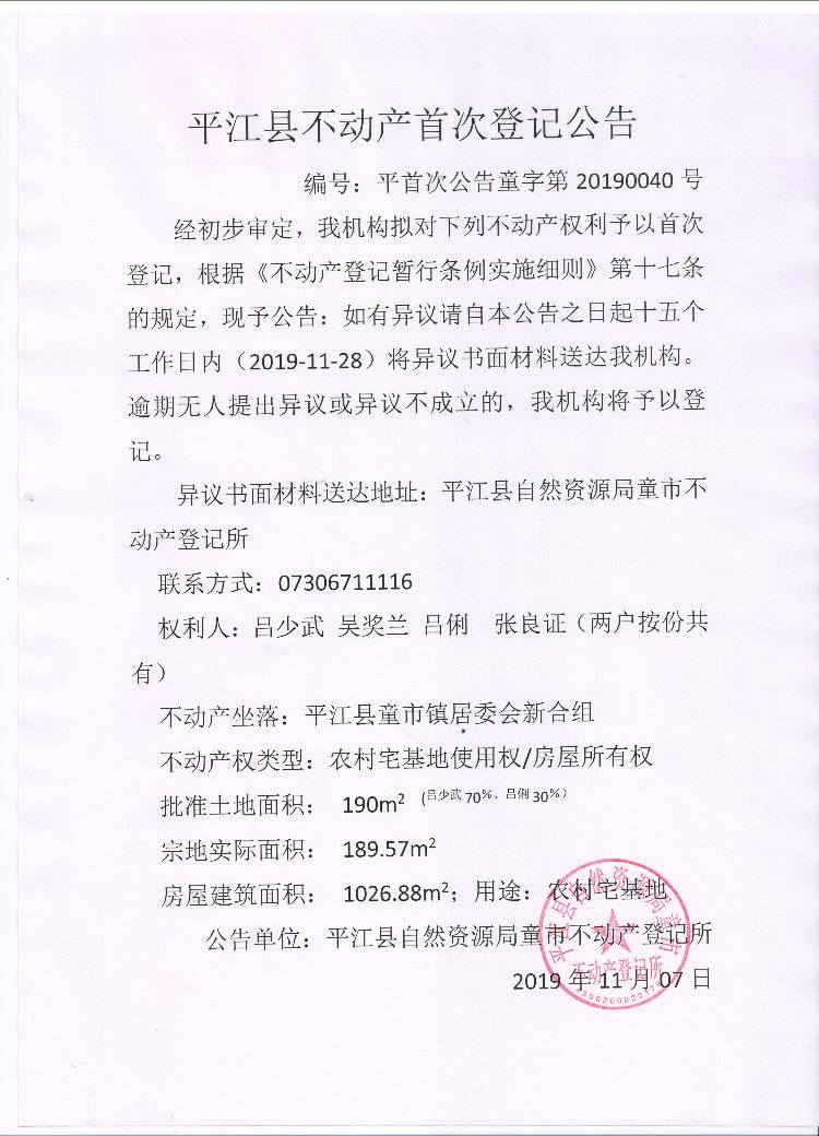 吕少武 吴奖兰 吕俐 张良证不动产首次登记公告