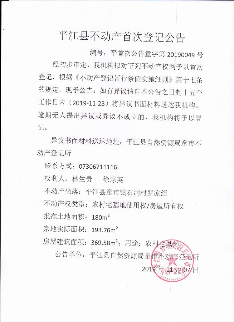 林生贵 徐球英不动产首次登记公告