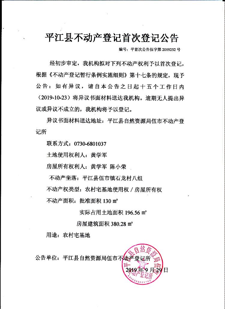 黄学军 陈小荣 平江县不动产首次登记公告 伍字第2019252号