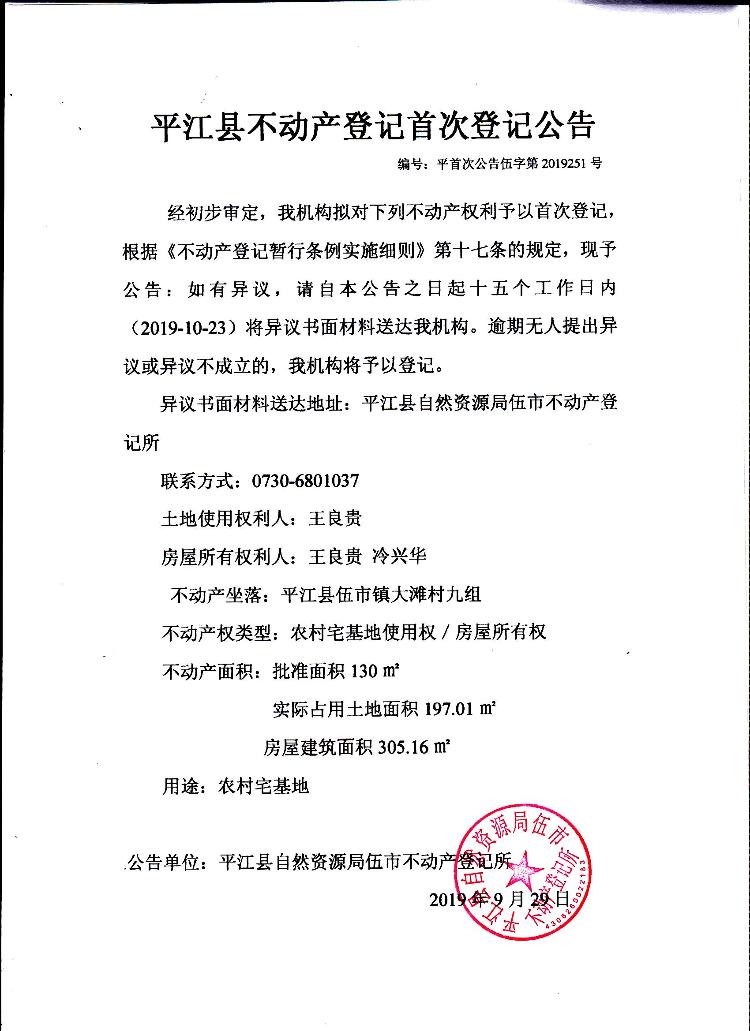 王良贵 冷兴华 平江县不动产首次登记公告 伍字第2019251号