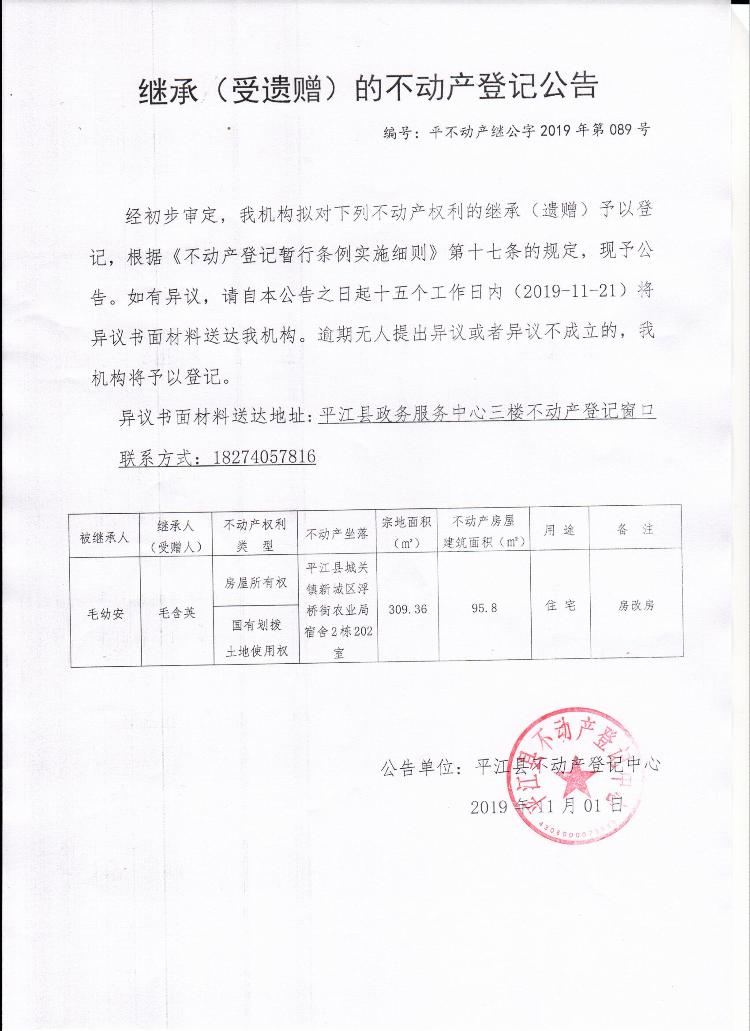毛含英继承(受遗赠)的不动产登记公告