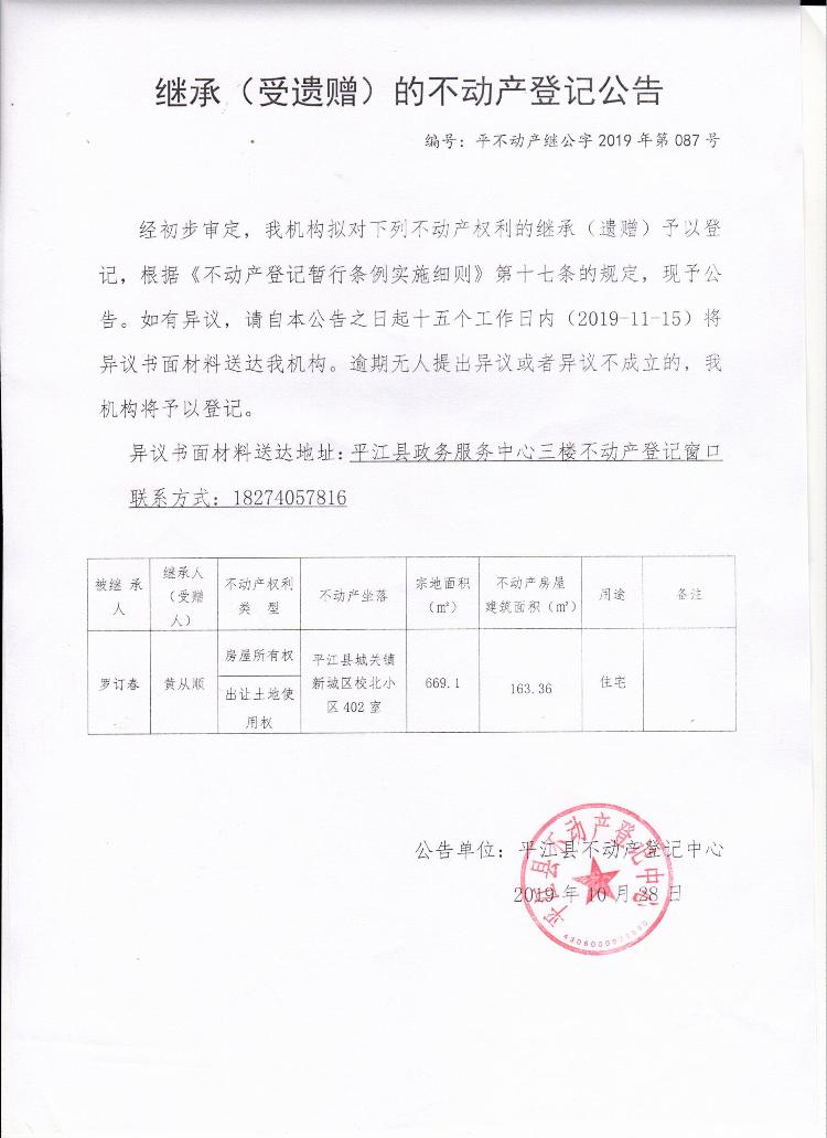 黄从顺继承(受遗赠)的不动产登记公告